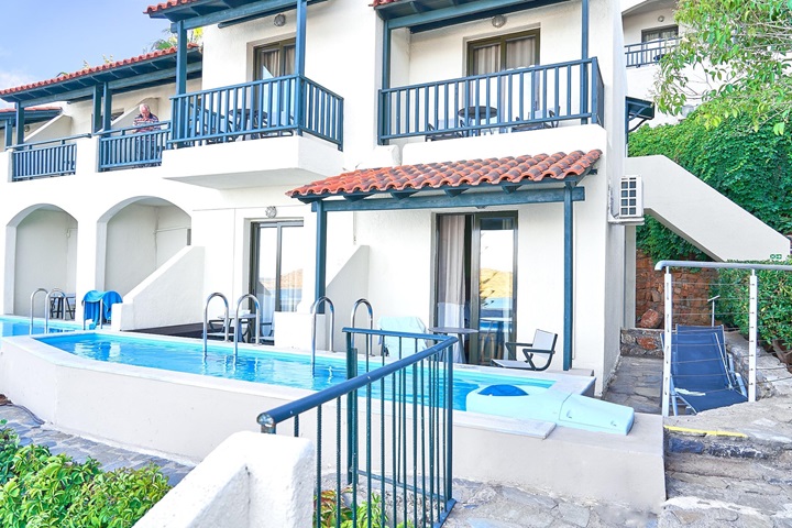 Es glänzt mit einem Panorama-Meerblick und seiner Authentizität. Architektonisch dem Mediterranen Stil treu geblieben, weiße Bungalows mit schönen Superior-Zimmern und Suiten mit privaten Pool und Meerblick. Das Hotel liegt nur 15 Fahrminuten vom Cretan Golf - Club.